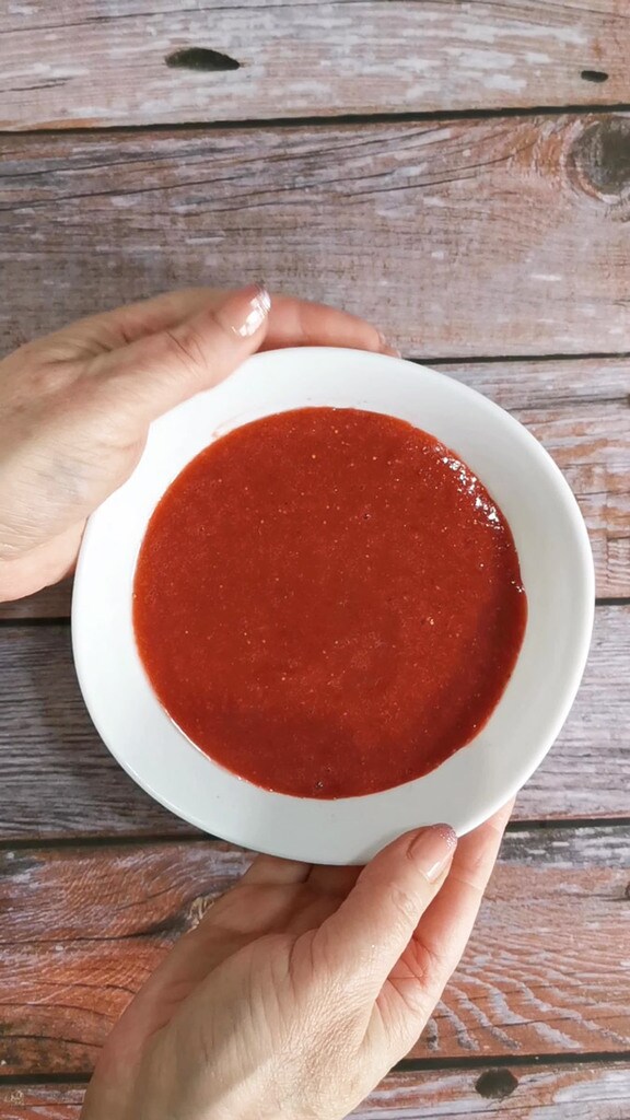 Zodra de aardbeien klaar zijn, mixen we ze in de mixer, ondertussen weken we 20 g gelatineblaadjes in koud water. Als de gelatine zacht is, voegen we deze toe aan de gemixte en warme aardbeien, “je kunt ze een paar seconden in de magnetron zetten”. We mengen goed en laten het mengsel afkoelen.