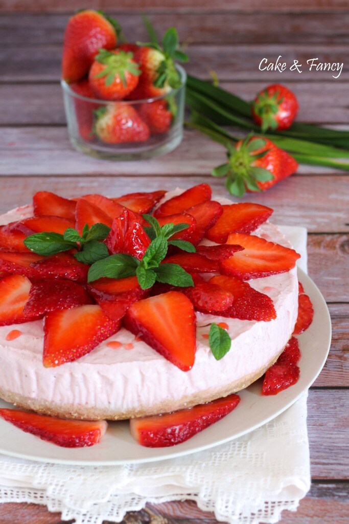 Na de tijd halen we de yoghurt cheesecake eruit en decoreren met aardbeien in partjes gesneden. Om een glanzend effect op het fruit te creëren, nemen we 1 of 2 aardbeien, voegen een beetje water en een paar theelepels poedersuiker toe. We doen alles in een pan en zetten het op laag vuur voor een tijdje, indien nodig zeven we de siroop met een vergiet. We laten het afkoelen en vervolgens borstelen we het over de aardbeien. Werk alles af met muntblaadjes en geniet van je traktatie!