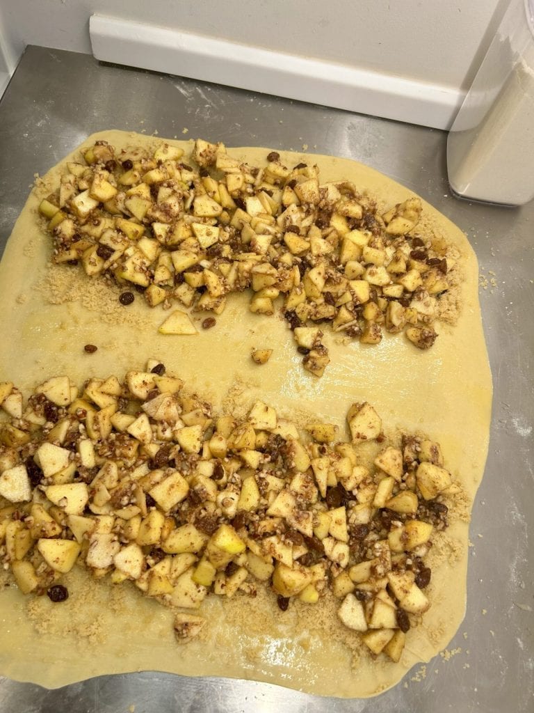 • Bestrijk het uitgerolde deeg met gesmolten boter en melk en verdeel het mengsel van boter en paneermeel over het oppervlak. Plaats ook alle appels, waarbij je de randen vrij laat om ze over zichzelf te kunnen vouwen. Op dit punt vouwen we voorzichtig de randen om het appelmengsel volledig binnenin af te sluiten.