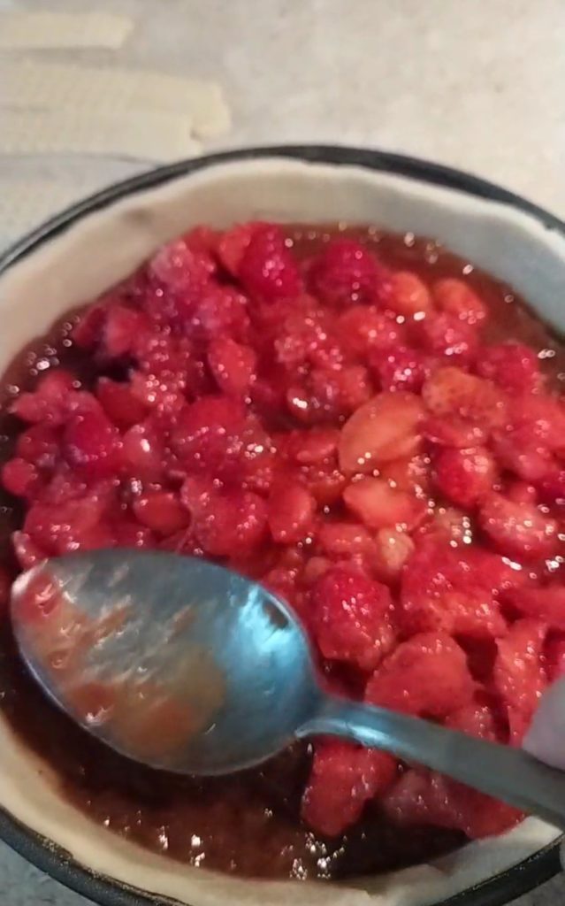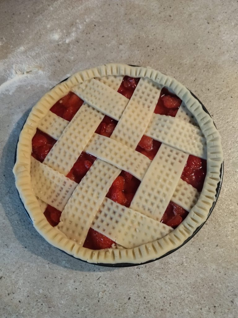 • Leg de repen over de aardbeien en kruis ze, versier de rand van de taart met het koord. Maak met een vork een patroon op de rand van de taart. Bak in de oven op 180° ongeveer 40 minuten.