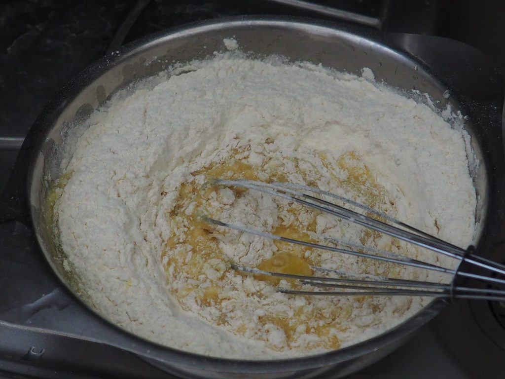 Voeg de bloem gemengd met het bakpoeder toe, roer eerst met een garde, daarna met een lepel of je handen.