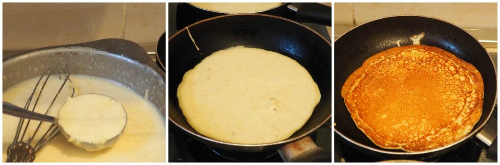 • Ik gebruik meestal anderhalve soeplepel per pannenkoek; met deze hoeveelheden maak ik er ongeveer 10.