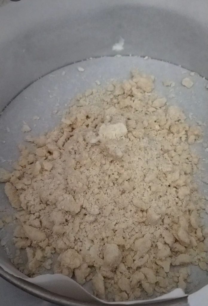 Voeg de boter in stukjes toe en begin te kneden. Je krijgt een kruimelig mengsel.
