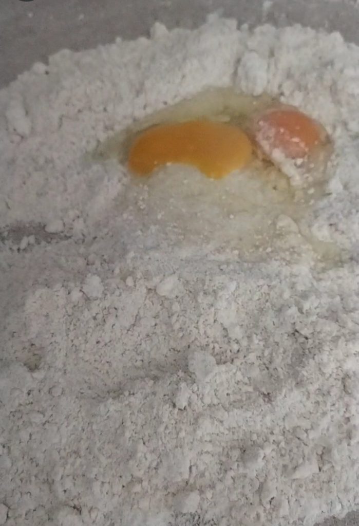 Voeg nu de eieren toe en meng alles. Je moet niet te lang kneden.