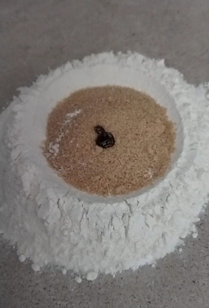 Doe op een werkblad de bloem, het bakpoeder, de bruine suiker en het vanille-extract. Begin de ingrediënten te mengen.