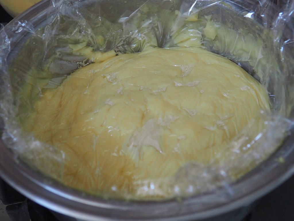 Doe het in een kom, dek af met plasticfolie en laat afkoelen. Je moet ongeveer 600 g banketbakkersroom krijgen.