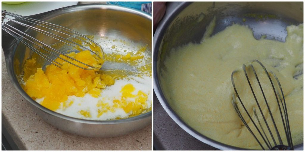 Doe in een kom de eidooiers met de suiker en klop met een garde totdat ze licht en romig zijn.