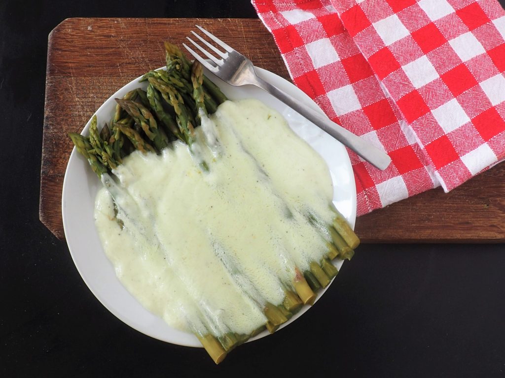 De saus moet niet te dik of te dun zijn, hij moet een lichte vloeibare consistentie hebben die de asperges kan bedekken zonder zich op het bord te verspreiden en zonder op te hopen.