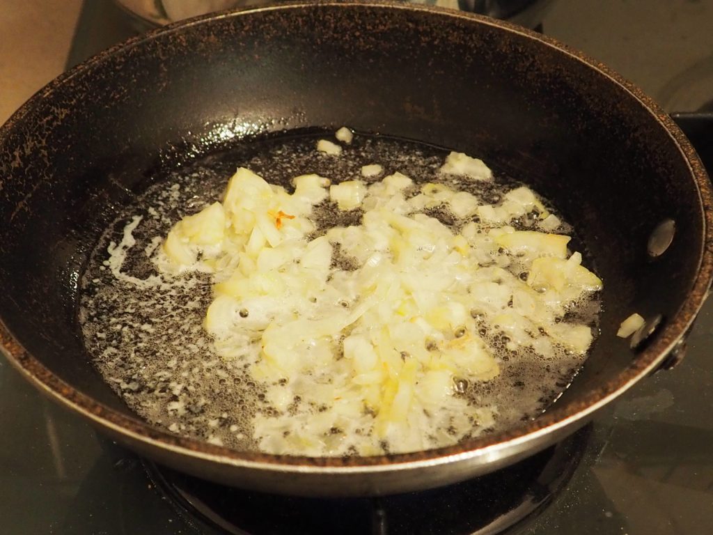 • Maak de ui schoon en hak hem fijn, doe hem in een pan met de boter en laat hem bruin worden.