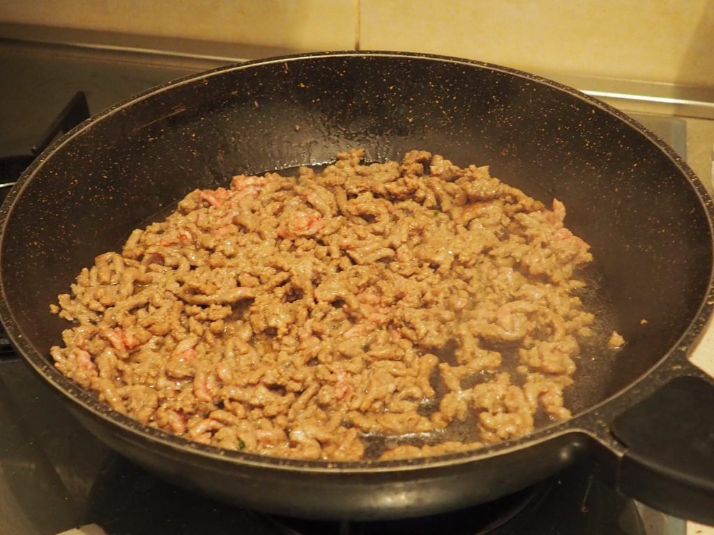 • Bak het gehakt in een andere pan in een beetje olie gedurende een paar minuten. Laat het uitdrogen, anders blijft het te vochtig.
