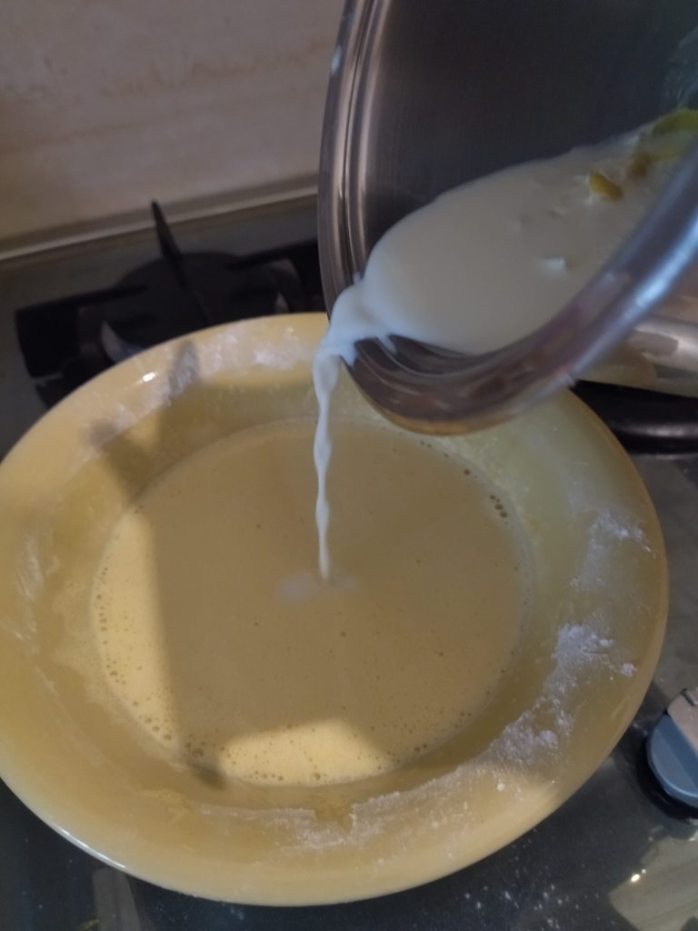 • Giet nu de warme melk in het eimengsel (gebruik een zeef om te voorkomen dat de schillen in de kom vallen), meng goed, zet het terug in de pan op het vuur en kook op middelhoog/laag vuur een paar minuten, vaak roeren. Ik heb ook de geraspte schil van een halve citroen toegevoegd voor meer smaak.
