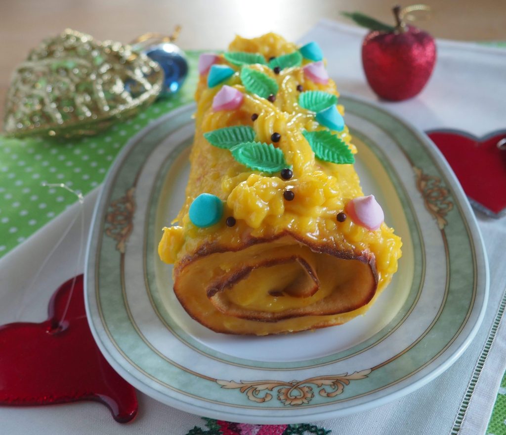 Laat de crème afkoelen.Rol de rol uit, smeer de sinaasappelcrème erop, rol alles opnieuw op.