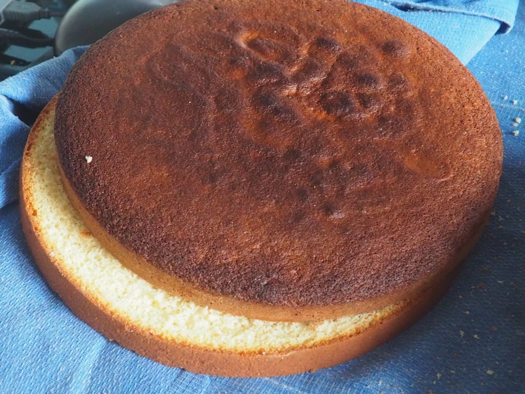 Snijd de biscuit in drie schijven van gelijke hoogte, leg de onderste schijf op een bord en bevochtig de bovenkant met 1/3 van de siroop. Ik heb een keukenkwast gebruikt, maar je kunt ook een flesje met een geperforeerde dop of een theelepel gebruiken.