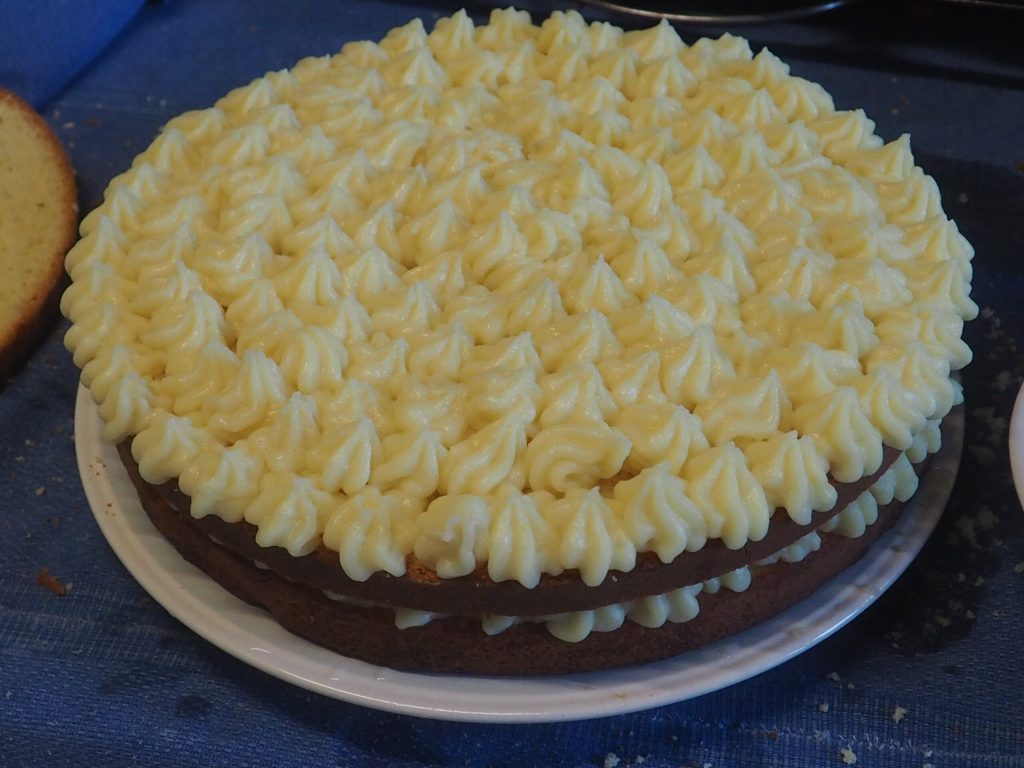 Leg de middelste schijf bovenop de laag banketbakkersroom, bevochtig het oppervlak met 1/3 van de siroop en bedek het met toefjes banketbakkersroom, opnieuw gebruikmakend van de spuitzak met stalen spuitmond. Je zult wat banketbakkersroom overhouden die je later kunt gebruiken om de soesjes te vullen en de taart mee te versieren.