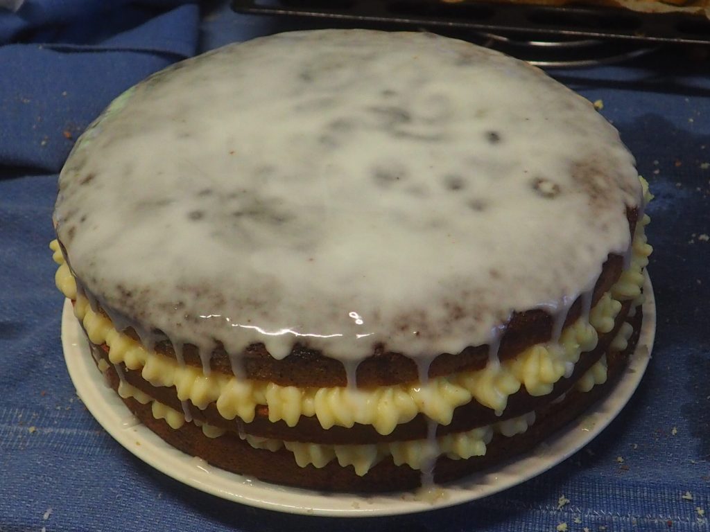 Bedek nu de oppervlakte van de taart met de glazuur, laat het gerust wat over de randen druipen.
