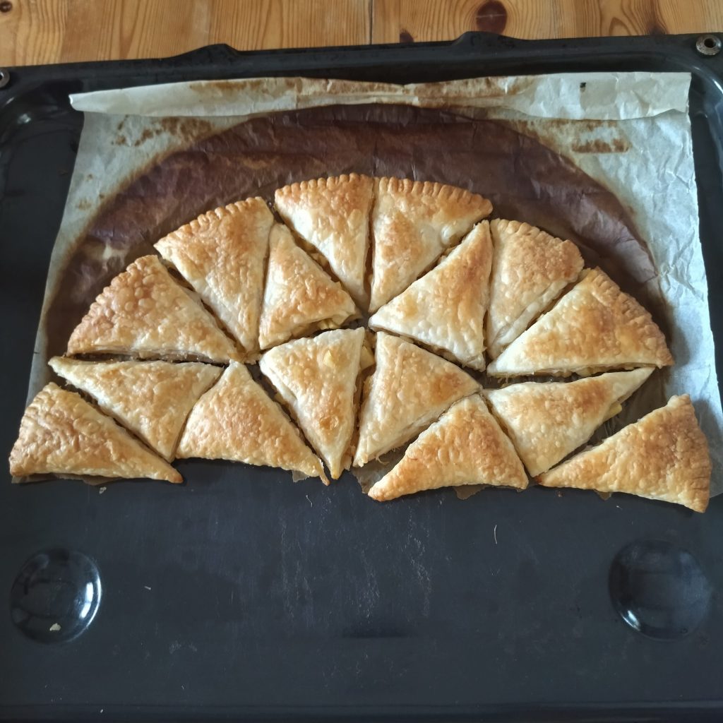 Hoe maak je gemakkelijk en snel driehoekjes van een cirkel of een halve cirkel? Hier is de oplossing voor u, u heeft in korte tijd heerlijke en gemakkelijk te bereiden zoetigheden. Deze bladerdeegdriehoekjes gevuld met appels en jam zijn in één hap te proeven.