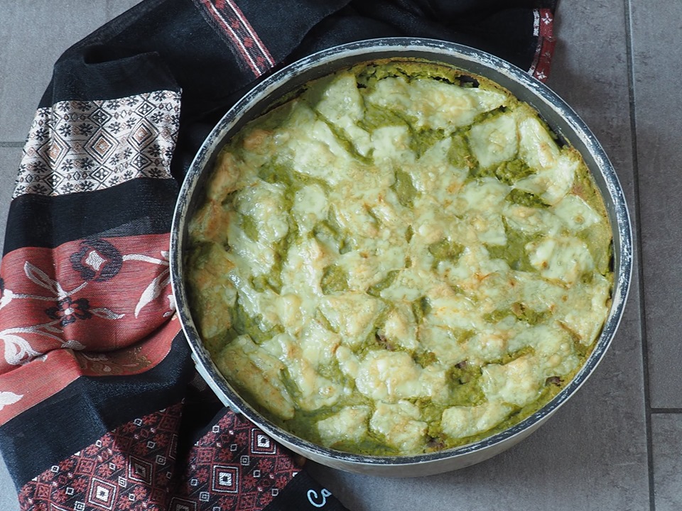 Leg op dit punt de bloemkool in een bakvorm van 30 cm zoals op de foto.Plaats de worst in stukjes erbovenop, voeg een laag erwtenpuree toe en bedek alles met plakjes Emmentaler.