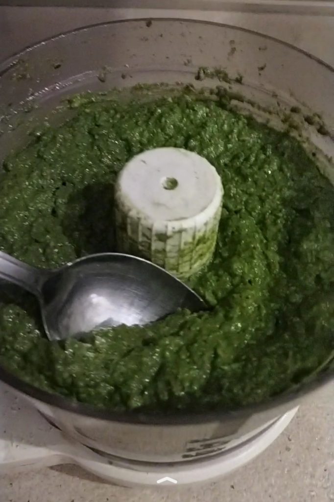 Ik hou van een pesto die niet te fijn is, maar een beetje grof, vrij vochtig. Nu hoef je het alleen nog maar te consumeren of in te vriezen. Ik stop het in vrieszakken, maar je kunt het ook in ijsblokjeshouders doen, dan heb je al miniporties klaar.