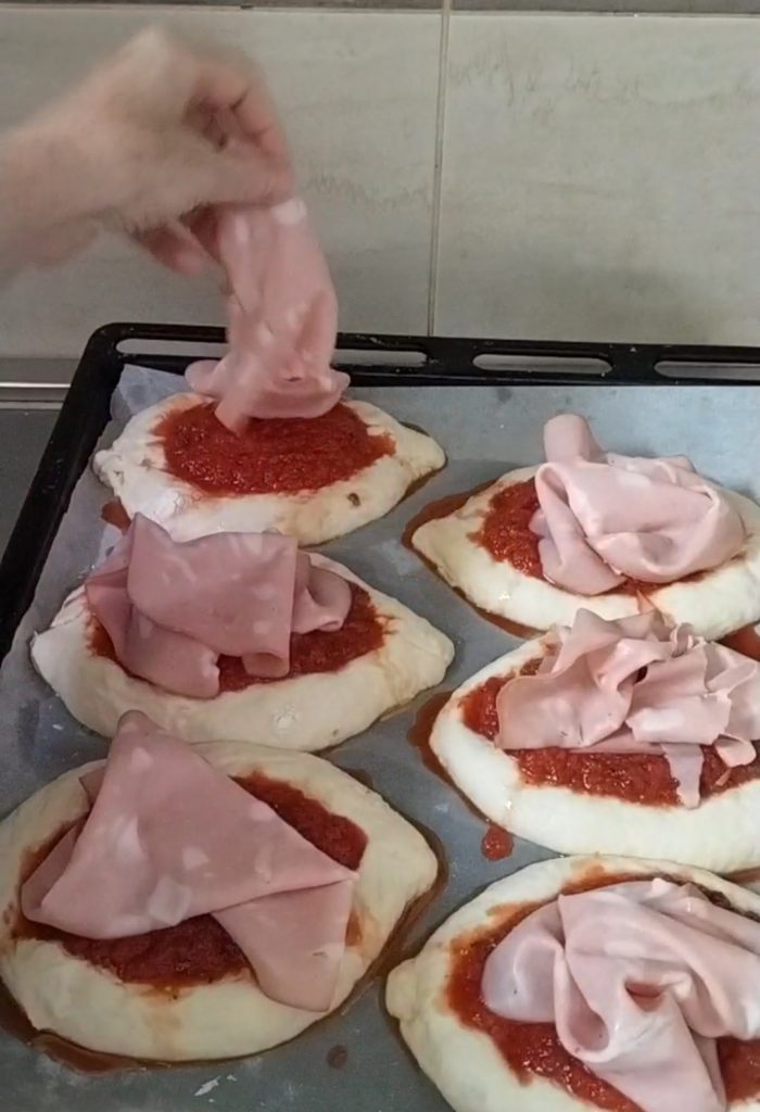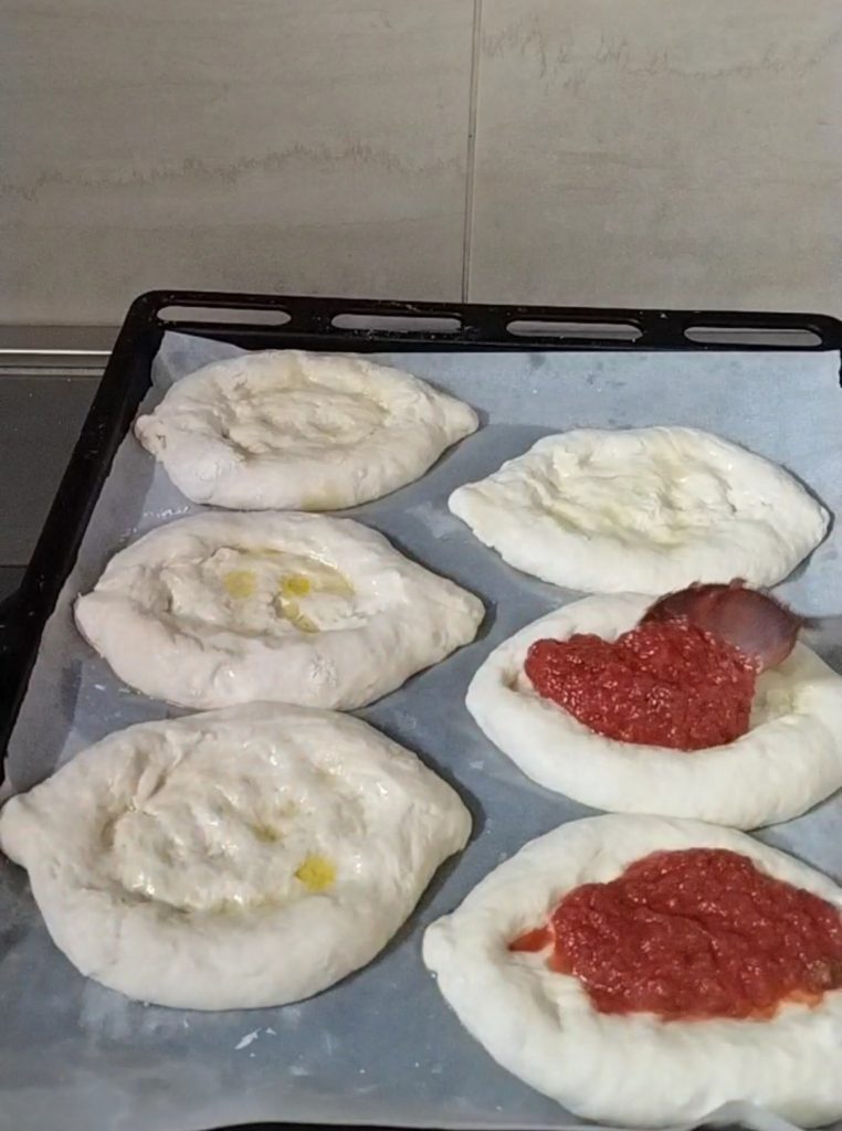 Plaats de bootjes op de bakplaat bedekt met bakpapier. Doe de tomatensaus in een kom, breng op smaak met oregano, zout en olie. Bedek elke pizzetta met een flinke lepel saus.