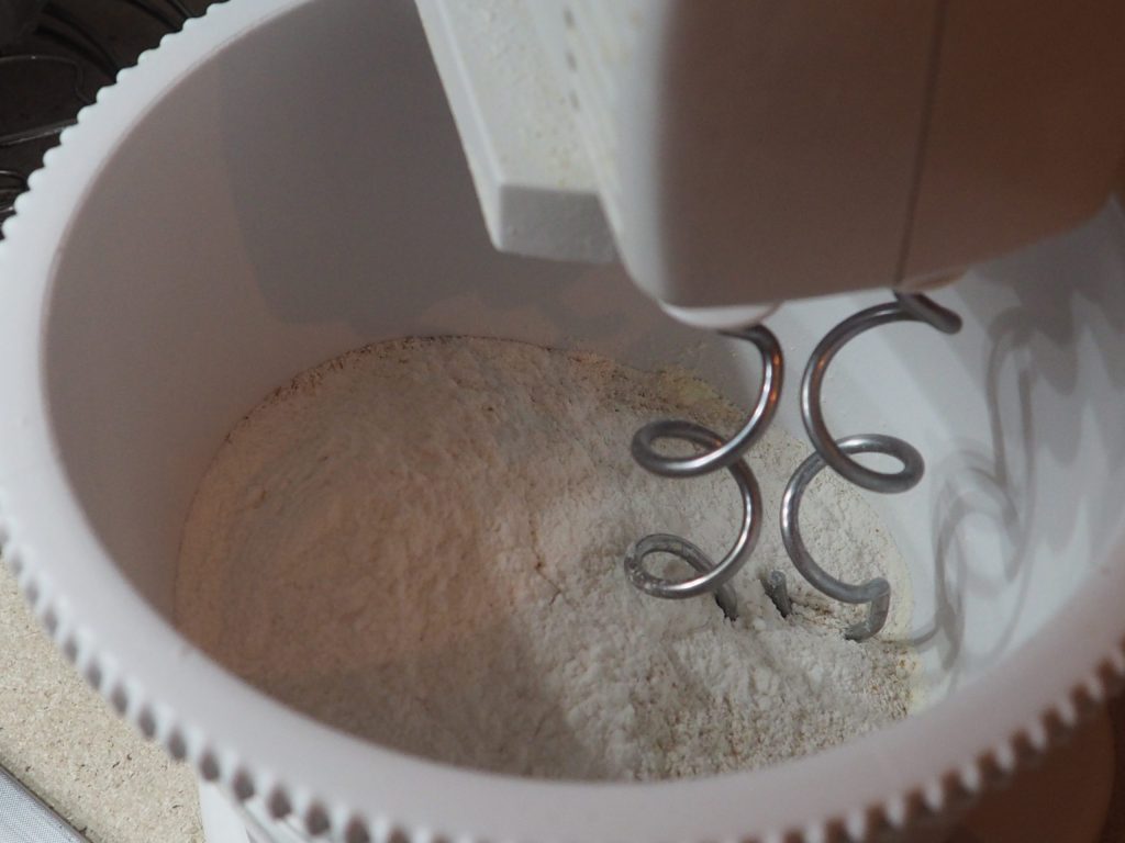 Als je geen bakkersgist hebt, kun je ook droge gist gebruiken, je hebt 10 gr. nodig, toe te voegen samen met het meelmengsel. Het proces blijft hetzelfde.