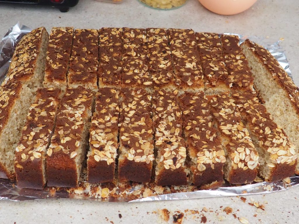 • Neem een bakplaat van 23×30 cm, vet deze in met boter, bestrooi deze met de eerder fijngehakte muesli (je kunt ook vlokken gebruiken).