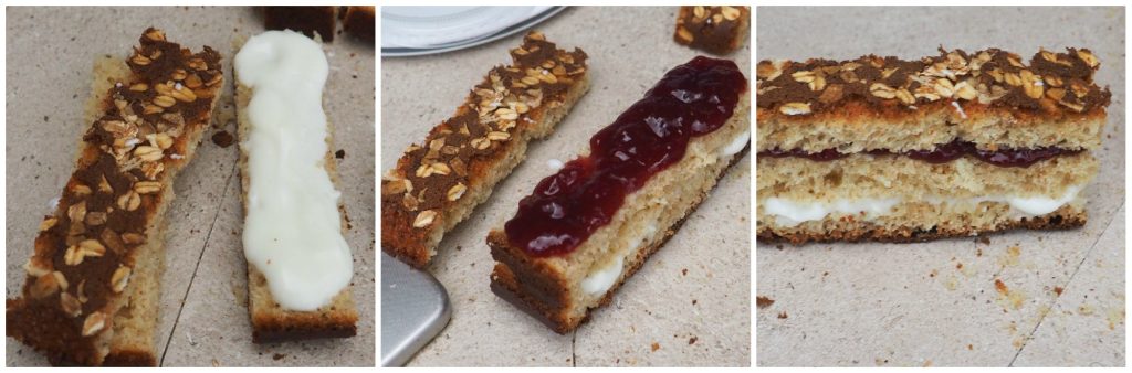 Smeer een laag yoghurt op de ene laag en een laag jam op de andere laag.