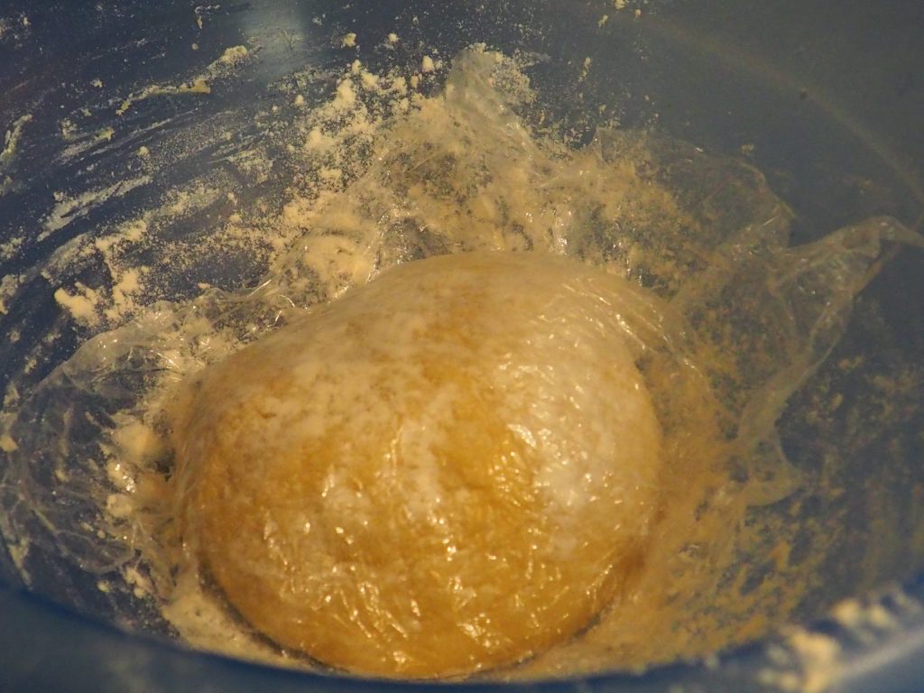 • Voeg de bloem toe en begin met de hand te kneden op een werkblad. Kneed goed tot het glad en niet meer plakkerig is. Vorm een bal en plaats deze in een met bloem bestoven kom, bedekt met plasticfolie en een theedoek. Laat het ongeveer 2 uur rijzen, het moet minstens verdubbelen.