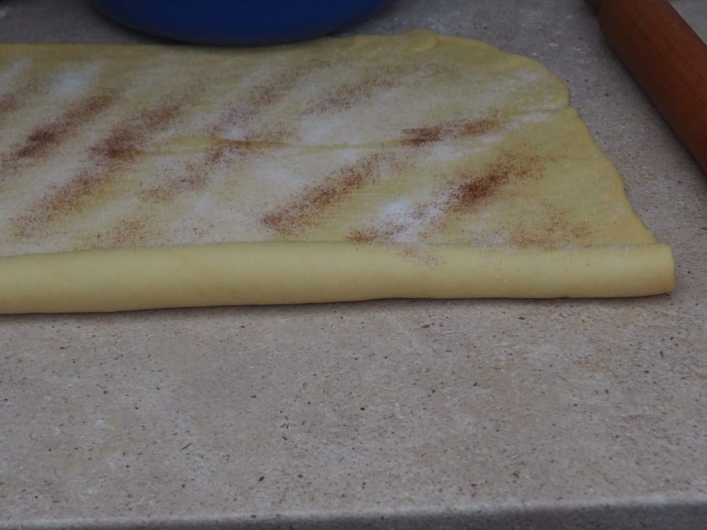 Laat de boter smelten in de magnetron en bestrijk het met een keukenkwast over het gehele oppervlak, strooi vervolgens gelijkmatig zowel de suiker als de kaneel en gehakte noten (als je wilt kun je de suiker, kaneel en noten mengen en dan verdelen over het deeg). Rol het op in de lengte, zodat een rol ontstaat.