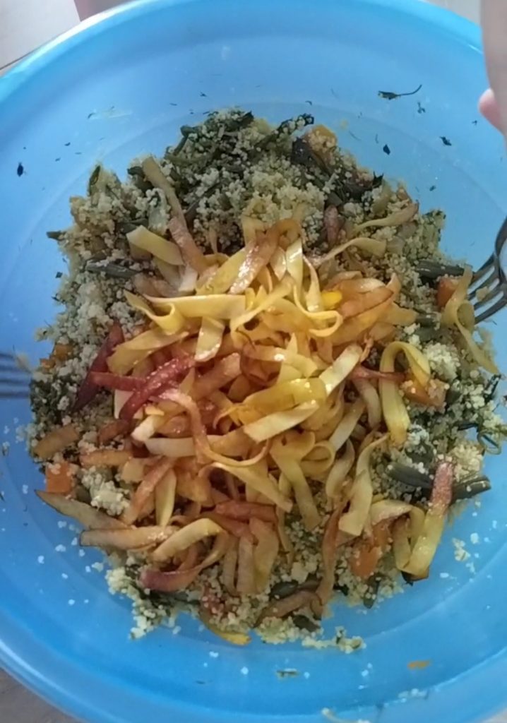 De couscous met groenten en nep-tagliatelle is een gerecht dat we vooral graag bereiden als het warm begint te worden. We vinden het leuk om smaken en geuren van verschillende culinaire culturen te mengen, om echt unieke gerechten te creëren. Wil je het vegan maken? Verwijder de geroosterde kipfilet, het zal net zo smaakvol zijn!