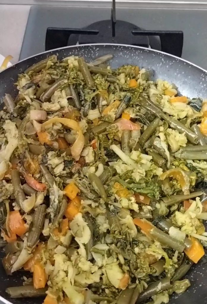 Was en reinig de paprika’s, wortelen en ui. Broccoli, bloemkool en boontjes zijn allemaal bevroren. Snijd alle groenten in vrij kleine stukjes. Doe een beetje olie in een grote pan, voeg eerst de wortelen, paprika’s, ui toe en laat een paar minuten koken. Voeg dan de andere groenten toe, voeg zout toe, smaak met een beetje knoflookpoeder en laat een paar minuten bakken, ze moeten knapperig zijn. Laat ze iets afkoelen.