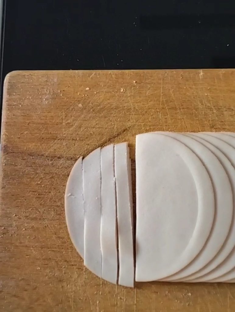 Ik heb geroosterde kipfilet gebruikt, in niet te brede reepjes gesneden.