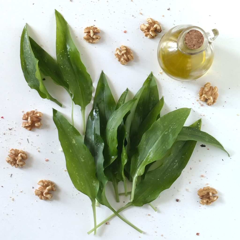 de lange en smalle bladeren met een vlezig textuur en een mooie diepgroene kleur, met een sterke knoflookgeur die vooral te ruiken is net nadat ze geplukt zijn, kunnen worden gebruikt om een aromatische pesto te maken (nadat ze goed zijn gewassen);