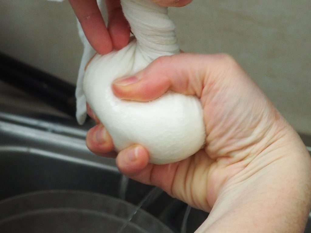 Knijp het goed uit, zodat al het water eruit komt.