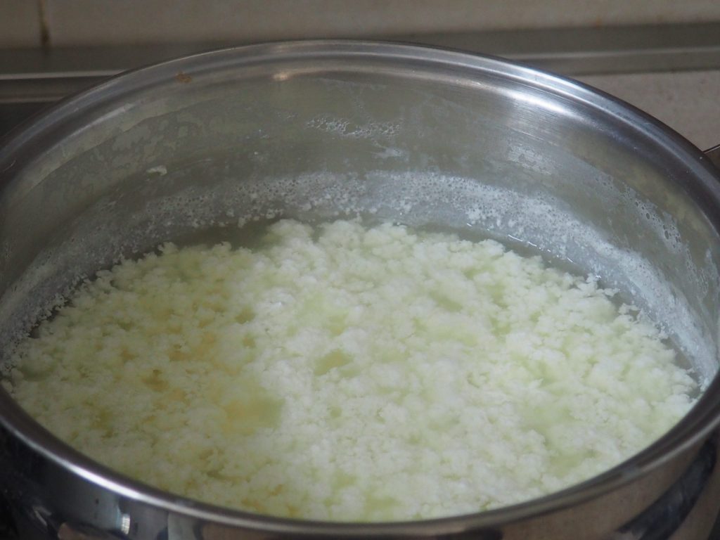 Giet het boven de pan met de inmiddels gevormde kaas.
