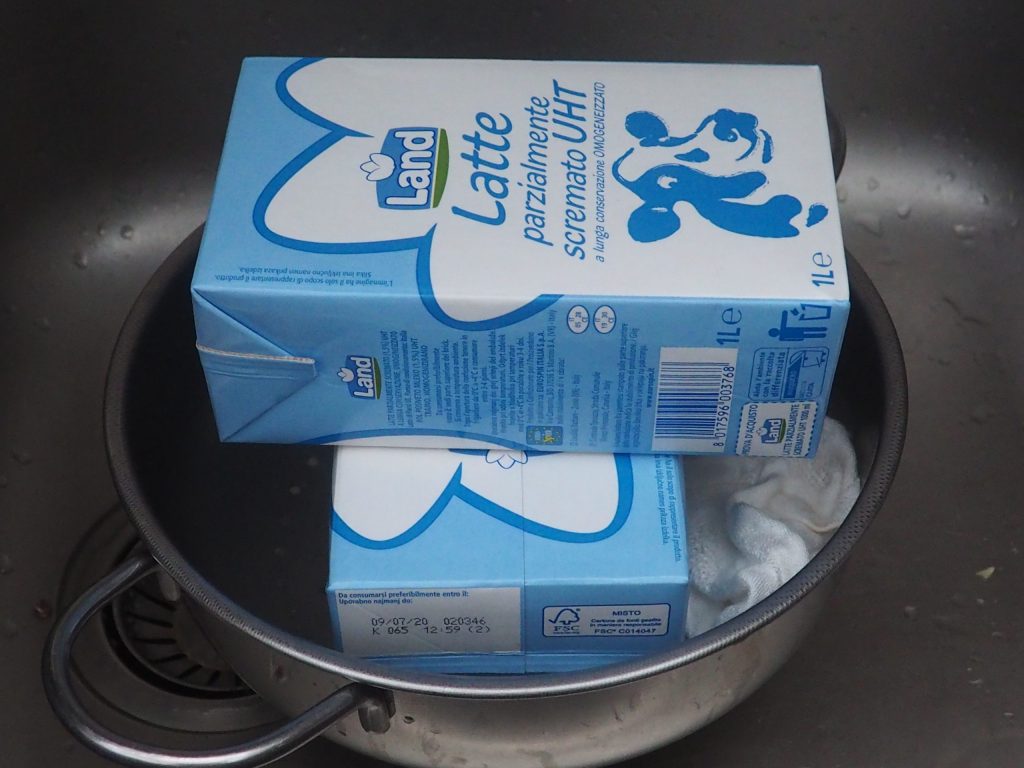 Leg nu een gewicht van ongeveer 2 kg erop en laat het ongeveer een uur drogen (ik heb er twee pakken melk op gelegd).