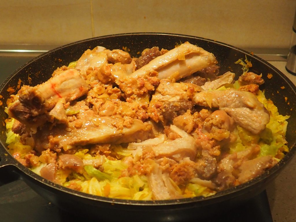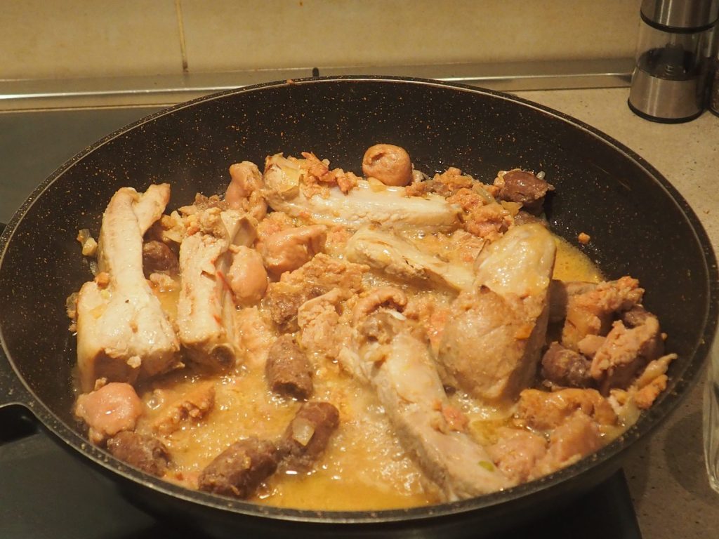 Voeg op dit punt de eerder geblancheerde en in reepjes gesneden varkenshuiden, de ribben, de verzini en de eerder gebakken worst toe.
