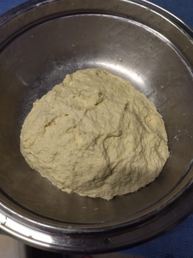 Doe de bloem in een kom, voeg de geactiveerde gist, het water toe, kneed en voeg het zout toe. Als het deeg te stevig is, maak dan je handen herhaaldelijk vochtig en kneed tot een glad, zacht en licht plakkerig deeg. Bestuif de bodem van de kom en het oppervlak van het deeg, dek af met huishoudfolie, een theedoek, een deken en laat rijzen voor een of twee uur.