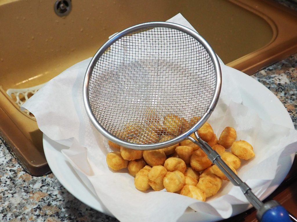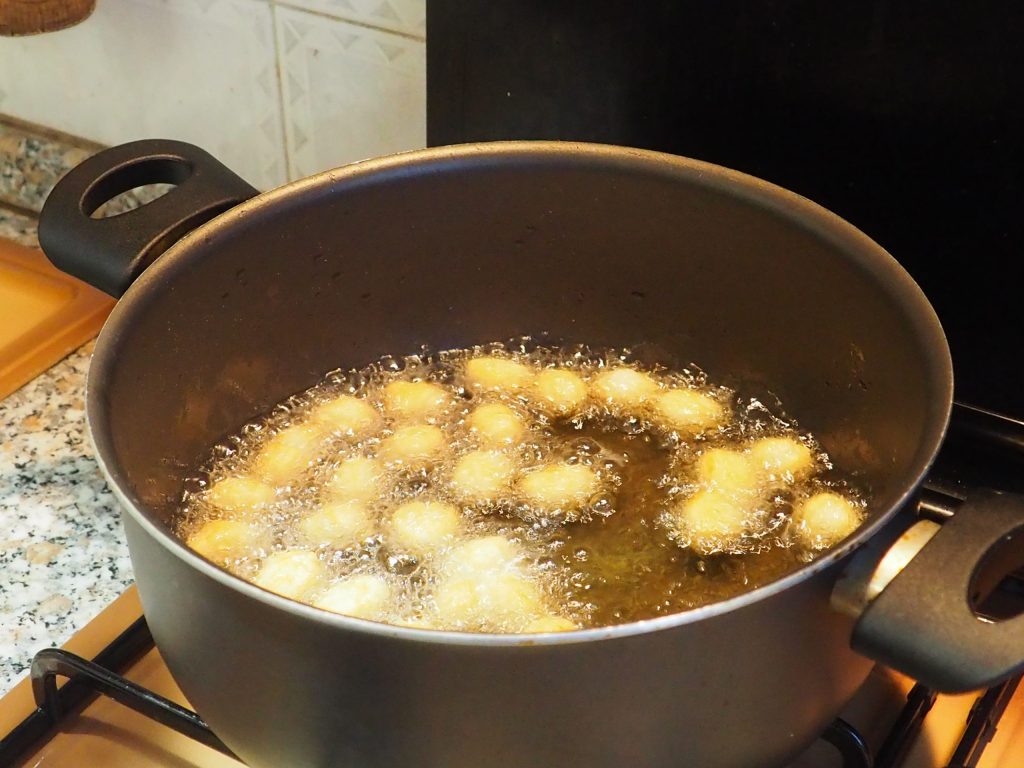 Verhit in een pan een liter zonnebloemolie tot het borrelt en frituur de Struffoli een beetje per keer.