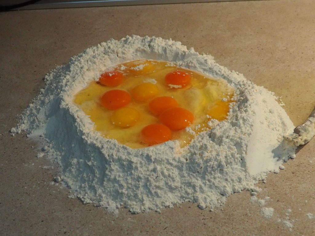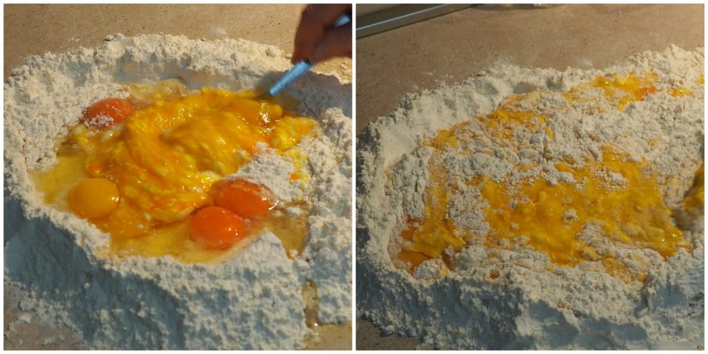 Leg de bloem in een fonteinvorm op een werkvlak, voeg de eieren, het snufje zout, de anijs en de olie toe.