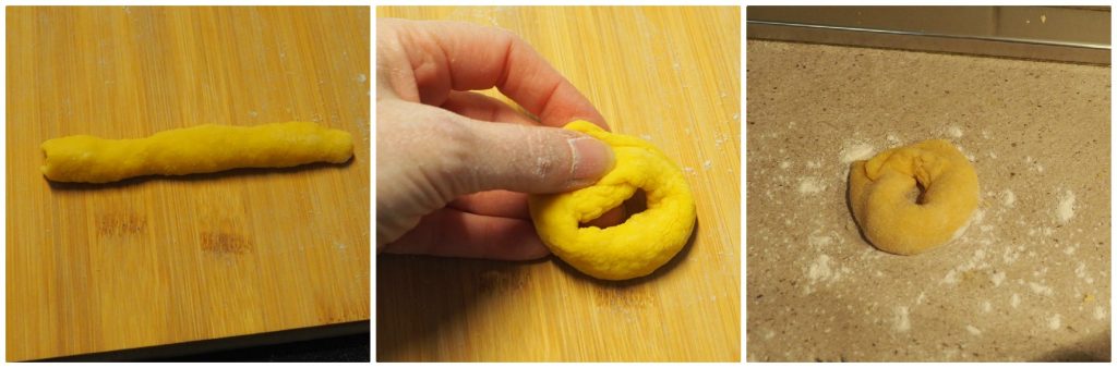 Snijd de reepjes in stukjes van ongeveer 10-11 cm, rol ze op en druk de uiteinden in met de duim om kleine taralli te vormen. Als het centrale gat te klein is, vergroot het dan een beetje met de handen.
