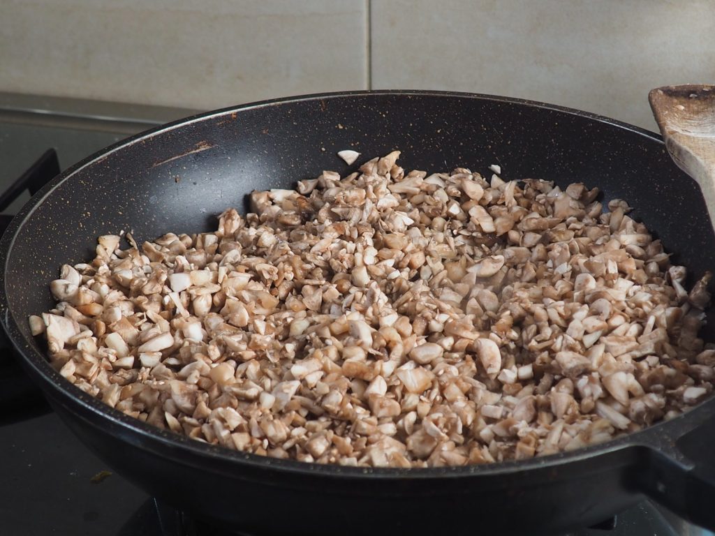 • Snijd de paddenstoelen in kleine blokjes (zowel de hoed als de stelen), doe wat olie in een pan, voeg de schoongemaakte knoflookteentjes toe en laat ongeveer een kwartier op middelhoog/laag vuur koken.