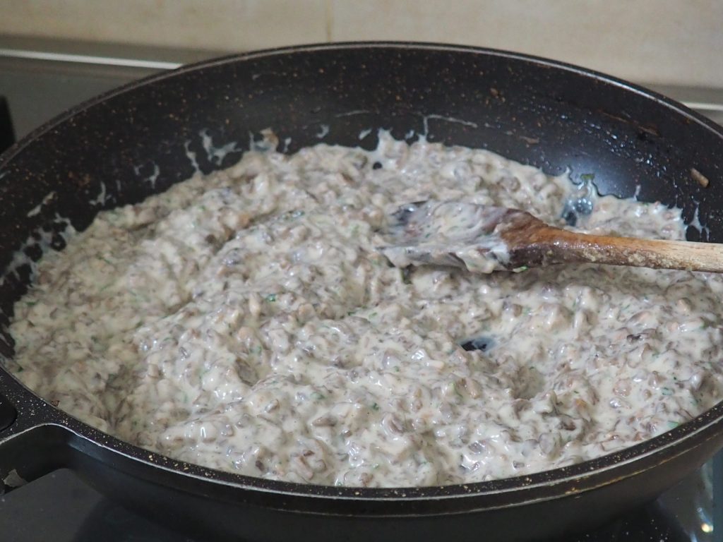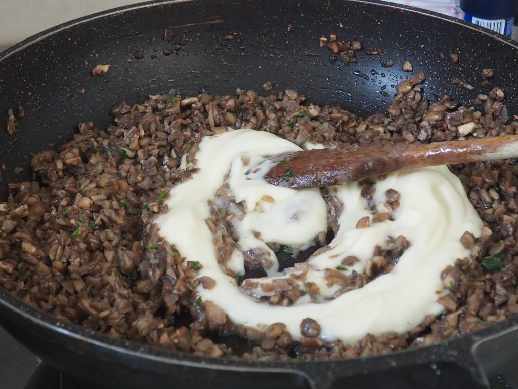 • Bedek ze met de champignonroom, zorg ervoor dat deze gelijkmatig over het hele oppervlak wordt verdeeld.