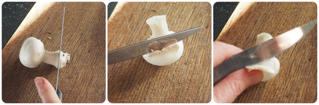 • Reinig eerst de champignons: verwijder het deel met aarde en wortels, verwijder met een scherp mes de bovenste huid van de hoed, maak de steel schoon van eventuele aarde door deze voorzichtig met het mes te schrapen. Veeg de hele paddenstoel af met een vochtige doek om alle resterende resten te verwijderen.