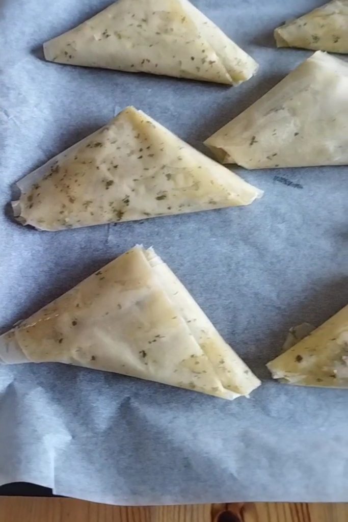 • Plaats de driehoeken op een met bakpapier beklede bakplaat en bak ze ongeveer 25 minuten op 180° op de tweede richel van onderen in de oven.