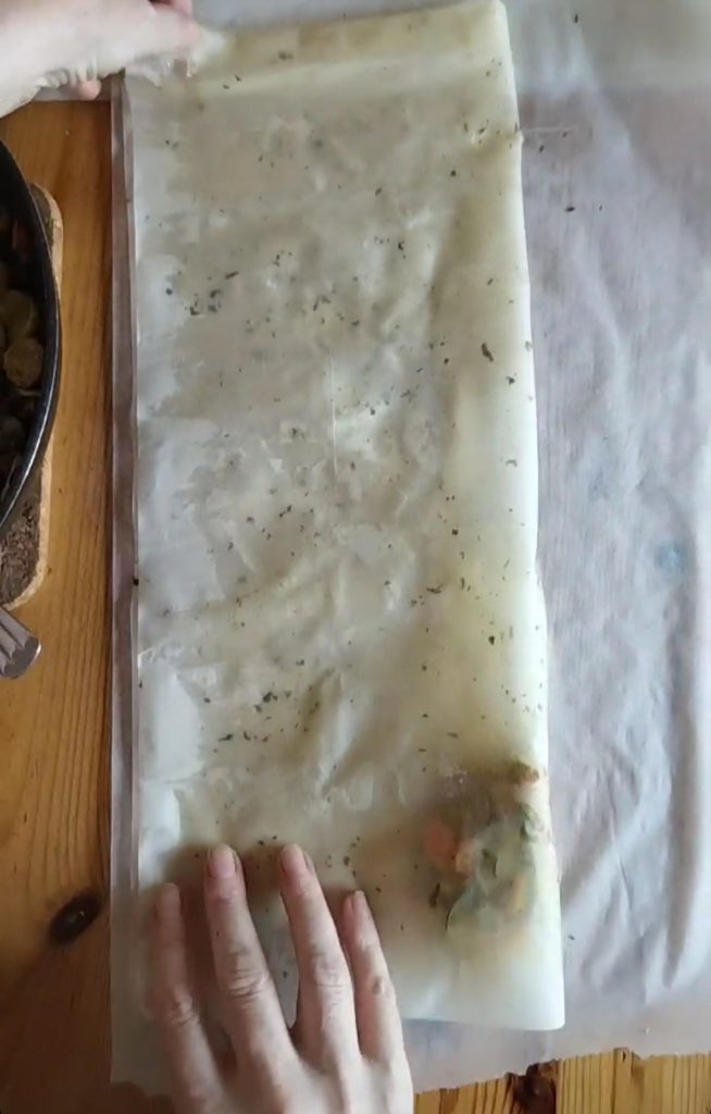 • Leg nu een lepel van het groentemengsel op het filodeeg.