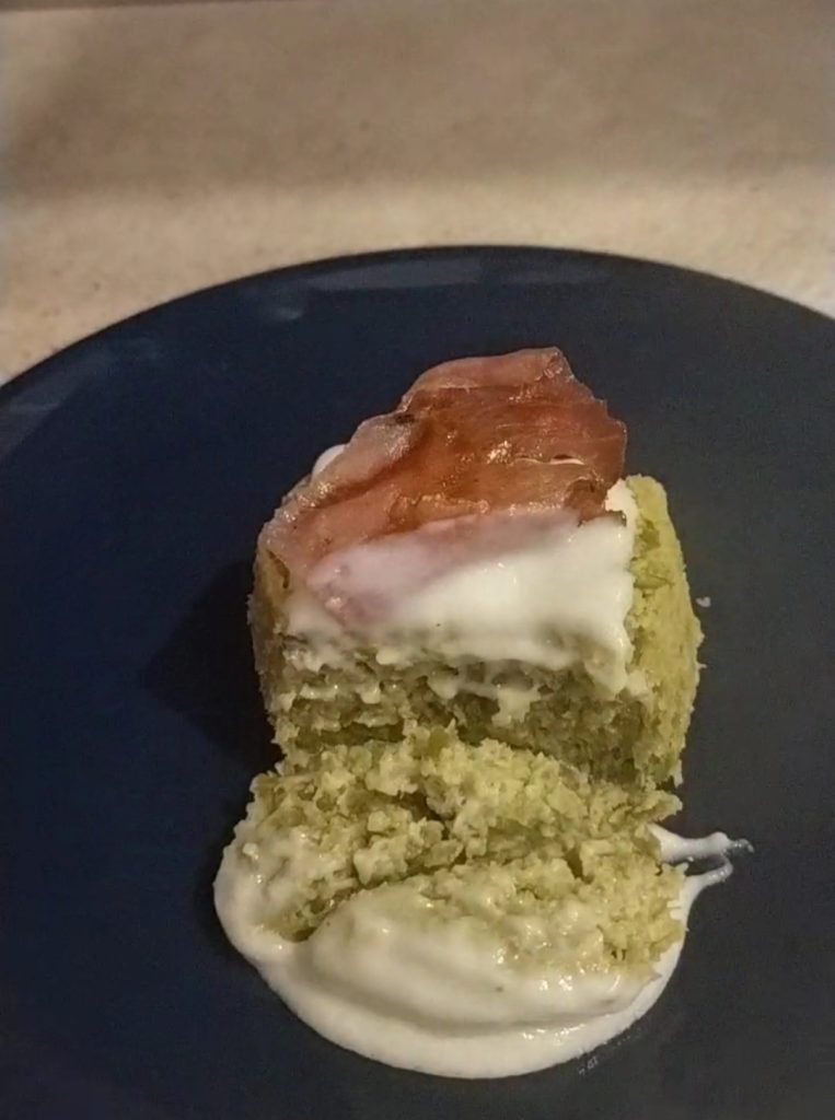 Je kunt het gerecht afmaken met een plakje spek die je eerder in de pan hebt geroosterd