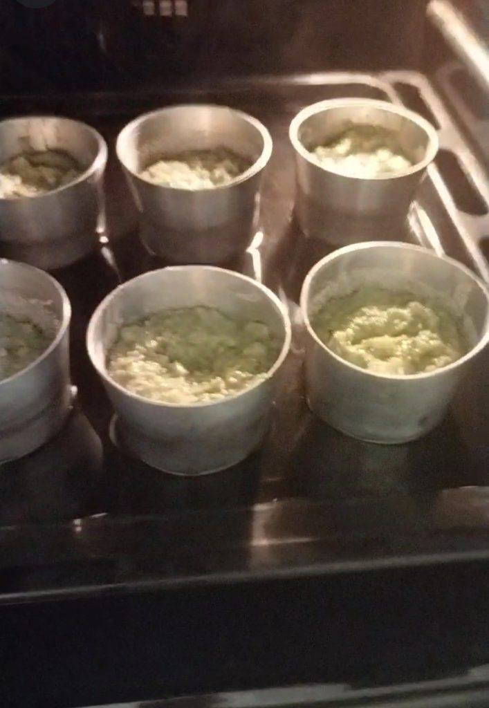 Plaats de vormpjes op de bakplaat, giet wat water op de bakplaat zodat ze au bain-marie kunnen koken. Bak op 180° voor ongeveer 30 minuten.