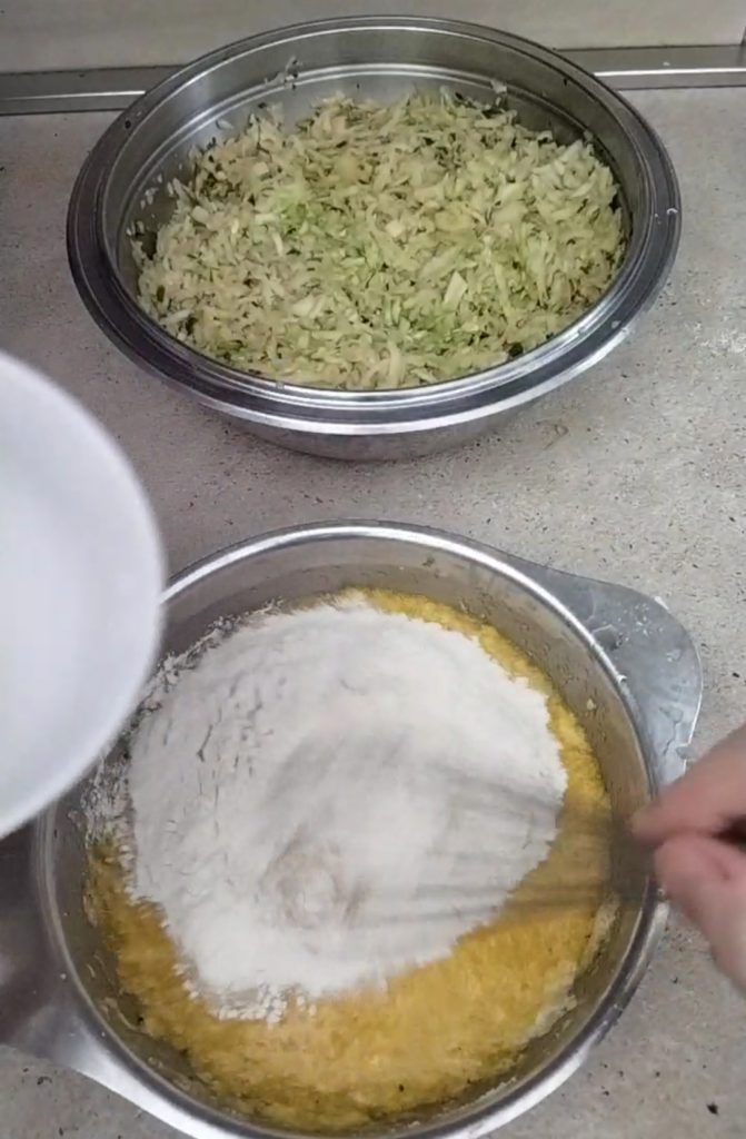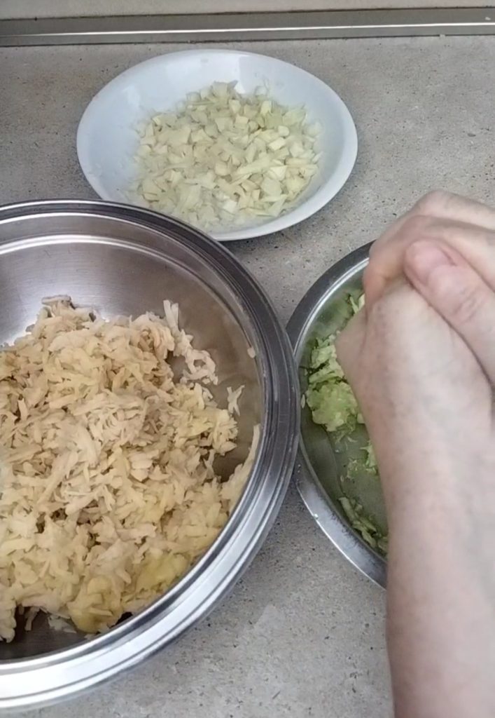 Neem nu een vrij grote kom en leg de aardappelen erin, uitgeknepen van het overtollige water. Voeg ook de uitgeknepen courgettes toe, waarbij je het overtollige water apart houdt.