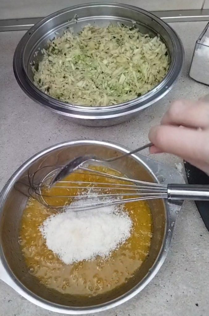 Breek in een andere schaal de eieren, voeg zout, gemalen zwarte peper, 4 eetlepels olie, 4 eetlepels water vrijgekomen uit de courgettes, Parmezaanse kaas toe. Meng goed met een garde.