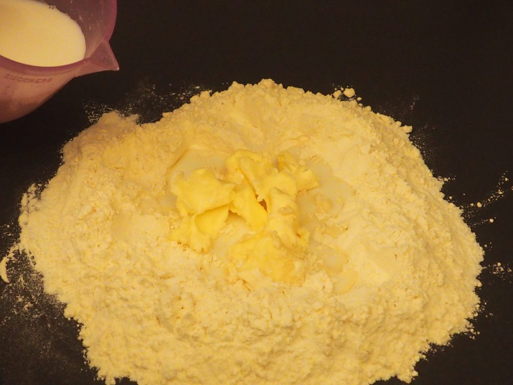 Op een werkblad, leg de bloem in een berg, voeg de boter toe en geleidelijk aan de net verwarmde melk.